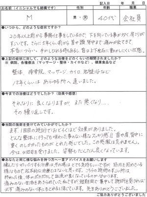 まず、1回目の施術でおどろくほど効果がありました。 どんな整体に行っても味わった事のない様なスッキリ感!!