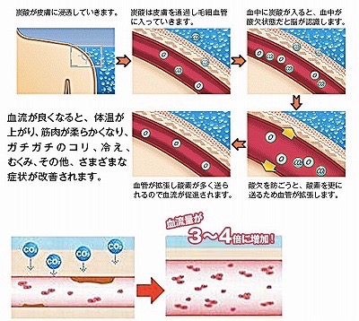 血行不良はさまざまな体調不良の原因になっています。 マッサージ等で血行不良の改善は見込めますが、刺激の強い施術は反動も同時に引き起こします。 揉み返しと呼ばれる施術後の痛みは、その中でも代表的なもののひとつです。 炭酸整体では炭酸のもつ血行促進効果を応用するため、 身体への負担が少ないうえ、相乗効果も得られる新しい整体法です。