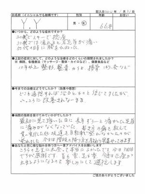 最初に見ていただいた日に長年ずうーっと痛かった足首に痛みがなくなっていた。歩き方の癖を教えて貰い実行した処、坂道を自転車で登れなかったのが登れました。 今日は階段の降り方を教わり早速やってみます。
